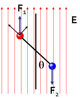 The dipole will also experience a force as a result of its orientation in the field. In the two charge case the force on particle 1 is qE in the z direction and the force on particle 2 is equal and opposite. The force on charge 1 can be resolved into components parallel to and perpendicular to the dipole moment. The parallel component is qE cos θ and distorts the molecule by stretching. The perpendicular component is a torque which turns the molecule towards its minimum energy orientation in the field. |