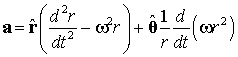 By Newton's second law the force is the mass of the particle times this quantity. It contains a term leading to acceleration of the radial distance, a term leading to the centripetal acceleration, both in the radial direction, and a term leading to acceleration of the angular coordinate.
